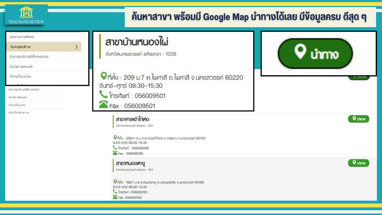 ช่องทางการติดต่อเยี่ยมเลย บอกถึงเบอร์สาขา พร้อมทั้งแผนที่ด้วย นี่แหละสิ่งที่คนอย่างเราต้องการ เพราะบางครั้งจะไปธนาคารก็ต้องเช็คด้วยว่า จังหวัดนี้มีธนาคารที่เราใช้บริการหรือไม่ ?