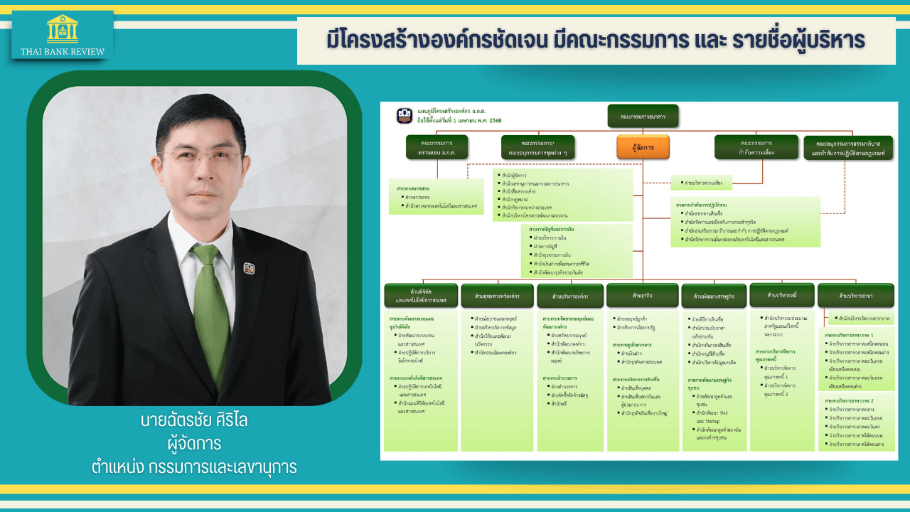 นายฉัตรชัย ศิริไล กรรมการและเลขานุการ แน่นอนว่า ธกส.มีโครงสร้างองค์กรอย่างชัดเจน พร้อมทั้งมีรายชื่อผู้บริหารที่สามารถตรวจสอบได้