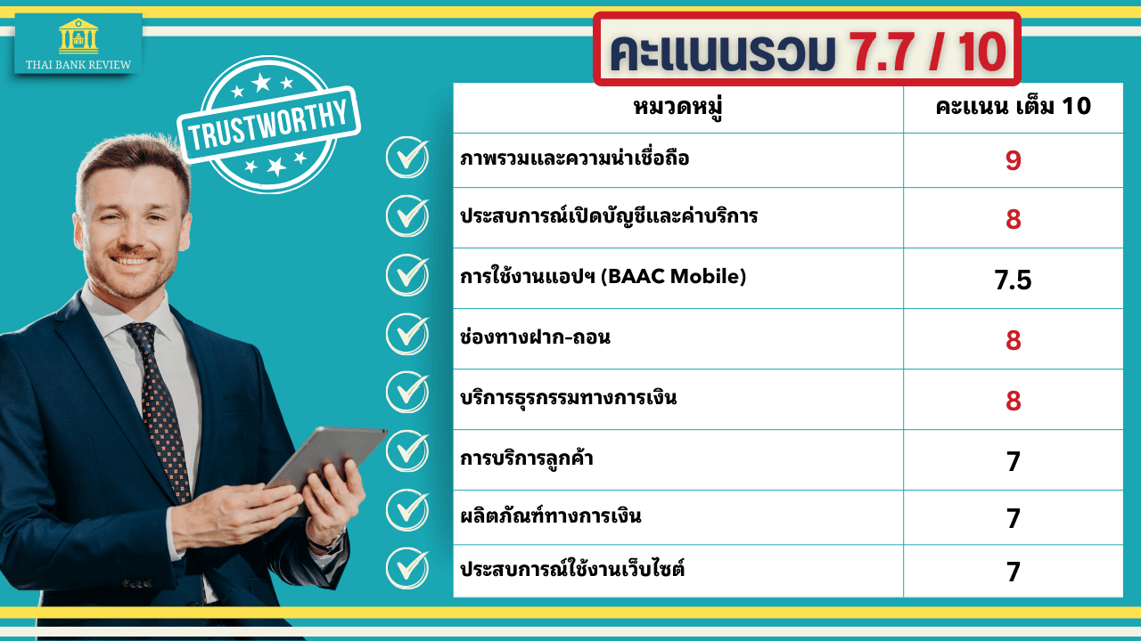ธ.ก.ส. มีจุดแข็งที่สาขาครอบคลุมทั่วประเทศ โดยเฉพาะพื้นที่ชนบทและชุมชนเกษตร ระบบแอป BAAC Mobile ใช้งานง่าย ฟังก์ชันครบ และมีช่องทางฝาก–ถอนหลายแบบ ทำให้การทำธุรกรรมสะดวก แต่บางครั้งแอปล่มหรือช้า เว็บไซต์ค้นหายาก และบางสาขายังรอคิวนาน โดยรวมเหมาะกับเกษตรกร สหกรณ์ และผู้ที่อยู่ต่างจังหวัด ถือว่า น่าใช้งานสำหรับกลุ่มเป้าหมายนี้ แม้ผู้ใช้ในเมืองอาจยังรู้สึกไม่ทันสมัยเท่าธนาคารพาณิชย์รายอื่น ๆ แต่สำหรับคะแนนก็ให้ในภาพรวมที่ 7.7 คะแนน