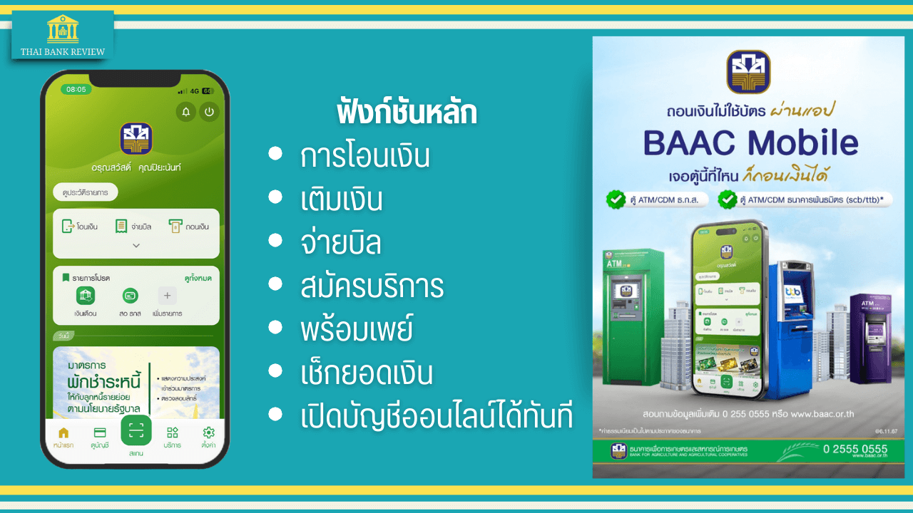 • การโอนเงิน: โอนผ่านแอป BAAC Mobile 24 ชั่วโมง รองรับพร้อมเพย์ เลขบัญชี เบอร์โทรศัพท์ และบัตรประชาชน โอนภายในธ.ก.ส. ฟรี โอนต่างธนาคารผ่านพร้อมเพย์ฟรีแบบเรียลไทม์