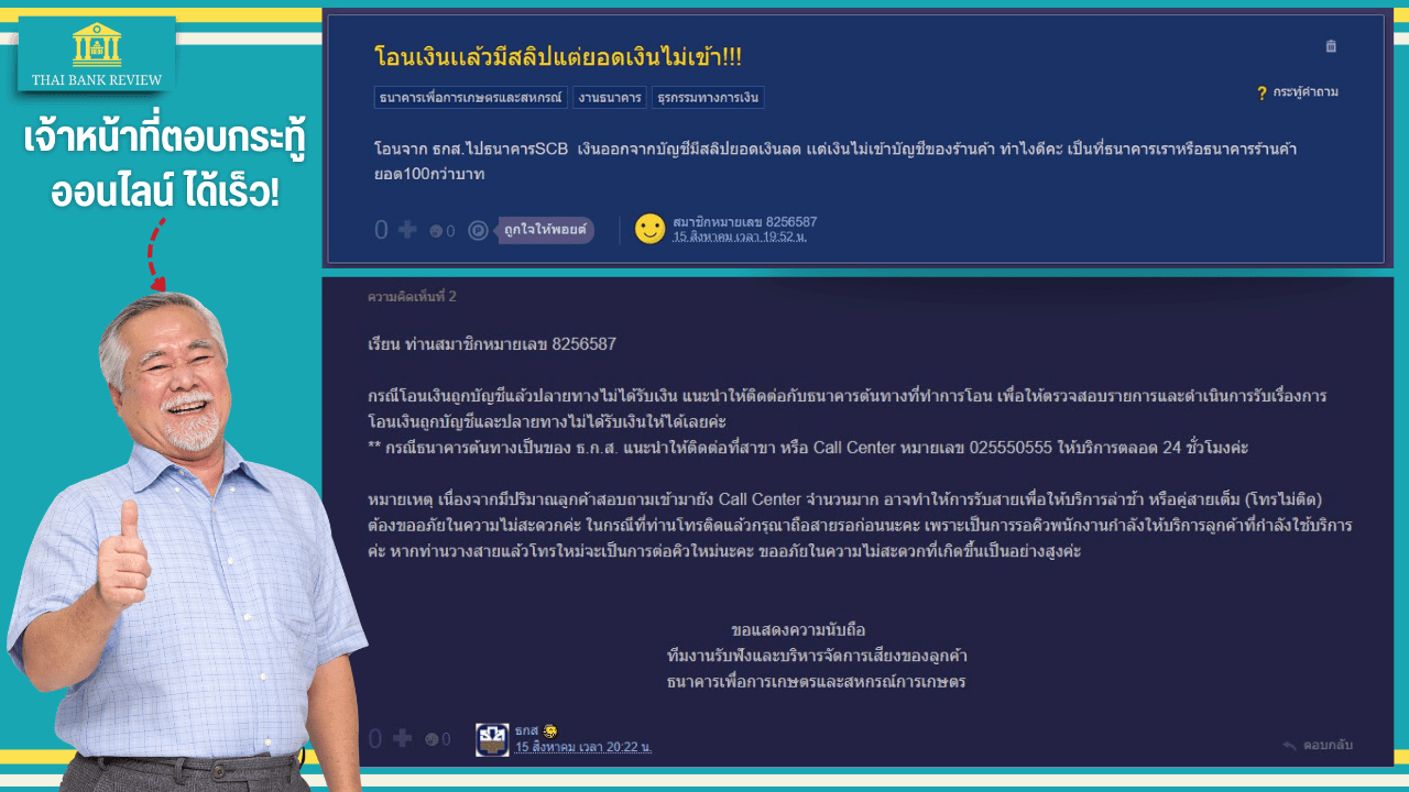 เมื่อลองค้นหาคำเกี่ยวข้องหรือปัญหาทางกระทู้ออนไลน์ Pantip พบว่า มีเจ้าหน้าที่ของ ธกส.ออนไลน์เข้ามาตอบปัญหาได้เร็วอยู่นะ