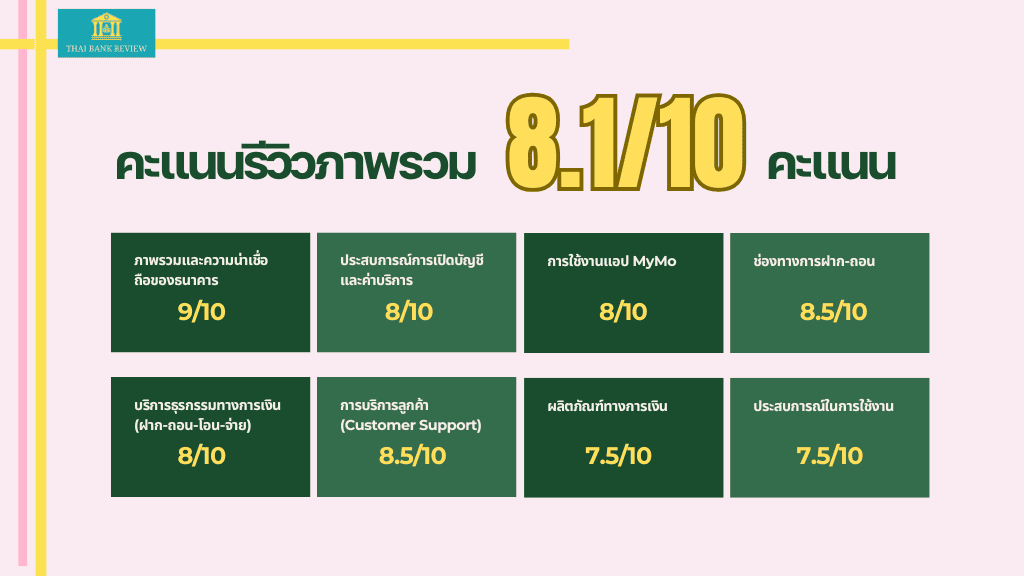 ธนาคารออมสินถือว่าเป็นธนาคารที่คนไทยคุ้นเคยเป็นอย่างดี มีความน่าเชื่อถือสูง มีจุดให้บริการทั่วถึงและยืดหยุ่น แอป MyMo มีฟังก์ชันตอบโจทย์ชีวิตประจำวันได้ดี ผลิตภัณฑ์เข้าถึงลูกค้าได้ทุกกลุ่มโดยเฉพาะกลุ่มที่รัฐบาลมีนโยบายช่วยเหลือและยังคงพัฒนาให้ทันสมัยอยู่เสมอ สมกับเป็นธนาคารแห่งการออมและช่วยเหลือสังคม คะแนนรีวิวภาพรวมที่ 8.1 คะแนน
