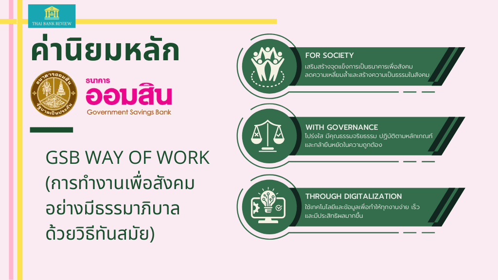 ค่านิยมหลักของธนาคารออมสิน GSB WAY OF WORK (การทำงานเพื่อสังคม อย่างมีธรรมาภิบาล ด้วยวิธีทันสมัย) ที่สะท้อนถึงวิสัยทัศน์ “ธนาคารเพื่อสังคม ที่เป็นผู้นำด้านการส่งเสริมการออม สร้างความมั่นคงให้กับประชาชน เพื่อการพัฒนาประเทศอย่างยั่งยืน”