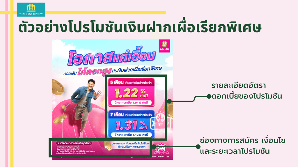 ตัวอย่างโปรโมชันการเปิดบัญชีเงินฝากเผื่อเรียกพิเศษ โดยแสดงข้อมูลอัตราดอกเบี้ยตอบแทน ช่องทางการสมัคร เงื่อนไขและระยะเวลาโปรโมชัน