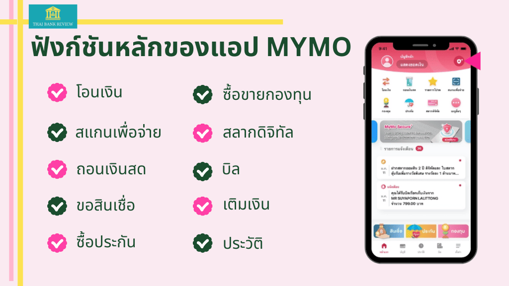 ฟังก์ชันหลักของแอป MyMo รองรับการใช้งานในชีวิตประจำได้ครบถ้วน ทั้งการโอนเงิน สแกนเพื่อจ่าย ถอนเงินสด ขอสินเชื่อ ซื้อประกัน ซื้อขายกองทุน สลากดิจิทัล บิล เติมเงิน และประวัติการใช้งานแอป