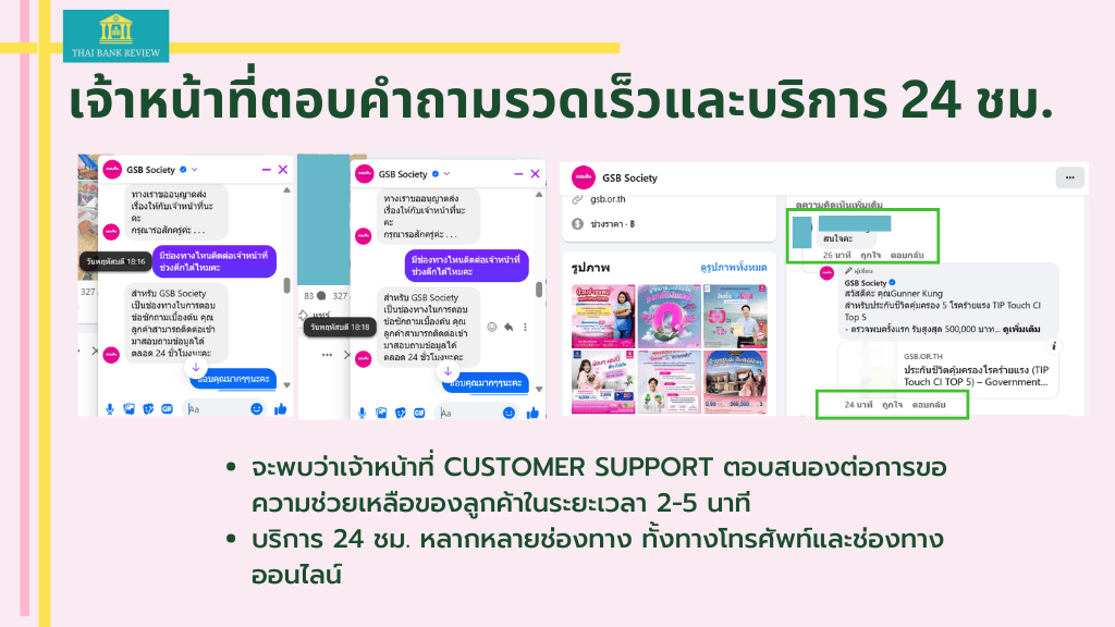 - มีบริการช่วยเหลือออนไลน์ 24 ชม. ผ่านเพจ GSB Society และ GSB Web Chat มีเจ้าหน้าที่ให้บริการตอบคำถามข้อมูลเบื้องต้นตลอด 24 ชม. อาจจะใช้เวลารอประมาณ 2-5 นาทีในการตอบคำถามทั้งนี้ขึ้นอยู่กับปริมาณผู้รับบริการ